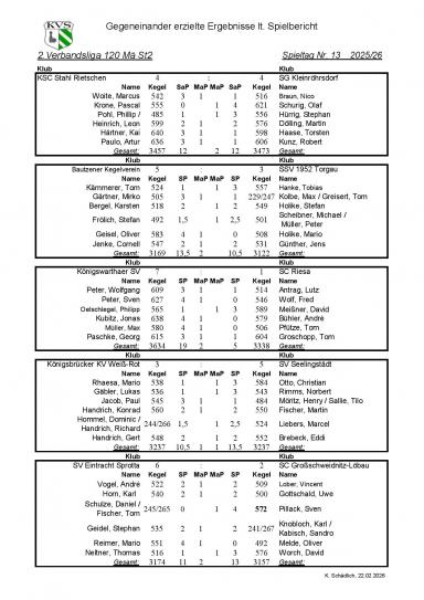 Wir spielten mit: Nico Braun 516 Holz (0MP), Olaf Schurig 621 Holz (1MP), Stephan Hürrig 556 Holz (1MP), Martin Dölling 576 Holz (0MP), Torsten Haase 598 Holz (0MP) und Robert Kunz 606 Holz (0MP).