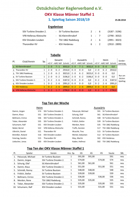 Am 25.08 2018 startete für unsere 1. Mannschaft die neue Saison. Mit den neuen Stammspielern Sven Bürger und Martin Dölling, hat die 1. eigentlich die besten sieben Spieler die es bei der SG gibt. Die Reise ging nach Dresden zu den Sportfreunden von Hellerau-Klotzsche. Unbekannte Bahnen haben uns bisher immer Glück gebracht. Unter leichtem Zeitdruck stand Olaf Schurig, was ihn aber am Kegeln in seiner gewohnten Art nicht hinderte. Mit 561 Holz spielte er zu Beginn gleich mal einen neuen Bahnrekord. Sein Mannschaftskamerad Tino Braun, (494 Holz) scheiterte knapp an der 500er Marke. Die im Mittelpaar startenden Sven Bürger(493 Holz) und Martin Dölling(498 Holz), verfehlten ebenfalls knapp die 500. Sie holten aber ganz knapp die wichtigen Mannschaftspunkte und da war klar, dass wir das Spiel gewinnen werden. Schlusspaar Stephan Hürrig(591 Holz) und Robert Kunz(595 Holz) konnten locker aufspielen. Es war zu locker. Der Sieg ist zwar nicht in Gefahr gewesen, aber mit den Ergebnissen werden beide nicht zufrieden sein. Am Ende kam für uns aber noch ein neuer Mannschaftsbahnrekord mit 3032 Holz aufs Papier. Supi Jungs.