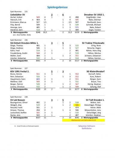 Am Samstag ging die Fahrt mit dem Bus nach Freital. Als Staffelsieger konnte uns nichts mehr passieren, wollten aber die zwei Punkte mit heim nehmen. Heiko Hornuff (552 Holz) konnte trotz einem Holz mehr seinen Punkt den Punkt nicht retten. Robert Kunz (552 Holz) ging als klarer Sieger von der Bahn. Das Geburtstagskind Sven Bürger (551 Holz) konnte sich kein Geschenk machen. Bei 603 Holz des Gegners, hatte Sven keine Chance. Tino Braun (511 Holz) konnte sei Potenzial nicht ganz abrufen und der Punkt ging an Freital. Nun lag es an Stephan Hürrig (567 Holz) und Olaf Schurig (544 Holz). Stephan war gut im Spiel und konnte auf Grund der besseren Holzzahl den Punkt holen. Olaf, mit ungewöhnlich vielen Fehlern, hatte er zwar den Gegner im Griff, aber am Ende fehlten uns 14 Holz zum Sieg. Es war eine gute Mannschaftsleistung, aber der Sieg ging verdient nach Freital.