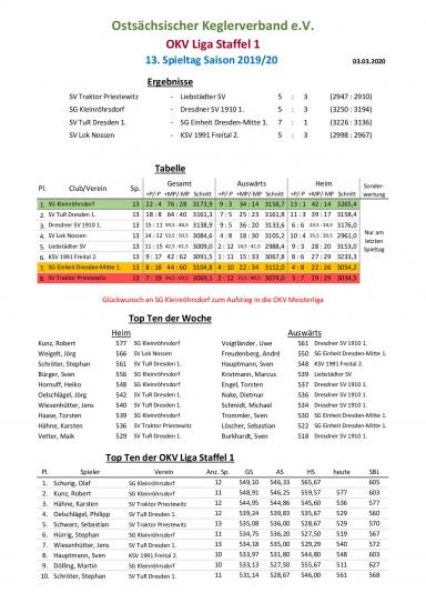 Zum letzten Heimspiel der Saison empfing die 1. Mannschaft die Spieler aus Dresden. Kurz vor dem Spiel entschieden wir, in der neuen Saison in die Dachwohnung des OKV (Meisterliga) aufzusteigen. Mit ungewohnter Startfolge und ohne Mannschaftsleiter Olaf Schurig sollte heut noch mal ein Sieg her. Startspieler Torsten Haase, aus unserer Zweiten (539 Holz, 1. Einsatz in der Ersten) schnupperte schon mal Ligaluft und mit seinem Ergebnis mitten drin bei den "Großen". Er konnte sich den Punkt sichern. In der kommenden Saison ist er auch Stammspieler in der Ersten Mannschaft. Stephan Hürrig (519 Holz) sein Pferd hatte sich heut etwas vergaloppiert und der Mannschaftspunkt ging nach Dresden. Robert Kunz (577 Holz) zeigte sich wieder in Topform und konnte ohne Probleme den Punkt für uns holen. Leider wird Robert uns in der kommenden Saison aus beruflichen Gründen nicht zur Verfügung stehen, aber in der Zweiten wird er nach Bedarf und Zeit mitspielen. Heiko Hornuff (548 Holz) war wieder gut drauf. Die gewonnenen vier Bahnen und der Punkt brachten uns auf die Siegerstraße, denn Sven Bürger, trotz der super 559 Holz musste sich mit zwei Holz geschlagen geben. Martin Dölling (511 Holz) war heute zu unkonzentriert und das wusste der Gegenspieler auszunutzen. Das Spiel war gewonnen und wir glücklich. Nun heißt es am 14.03.2020 im letzten Spiel in Liebstadt noch mal der Favoritenrolle gerecht zu werden und als Sieger von der Bahn zu gehen.