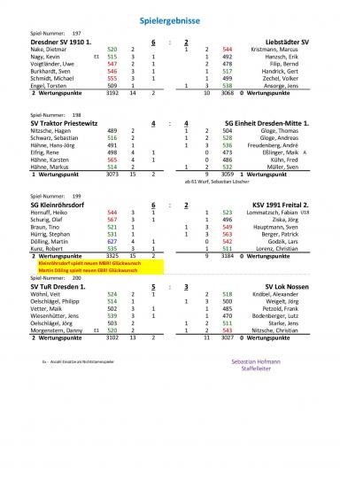 Wir spielten mit: Heiko Hornuff 544 Holz (1MP), Olaf Schurig 567 Holz (1MP), Tino Braun 521 Holz (0MP), Stephan Hürrig 531 Holz (0MP9, Martin Dölling 627 Holz (1MP) und Robert Kunz 535 Holz (1MP).