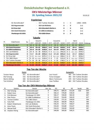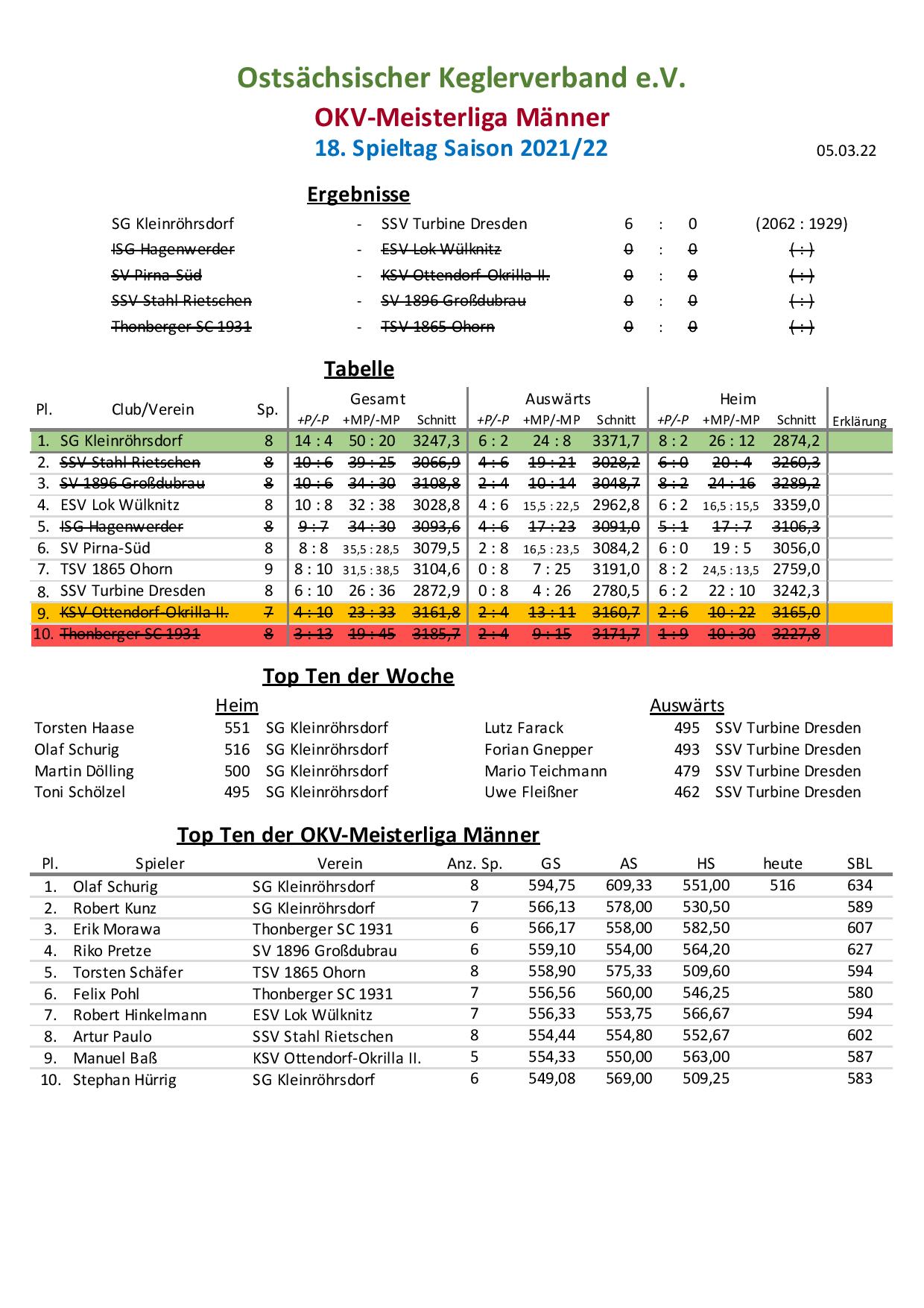 Nach langer Corona-Pause ging es nun wieder los. Seit dem 19.02.22 wird der Spielbetrieb im Bereich des OKV unter anderer Spielweise fortgesetzt. Nach einer Umfrage wird nur noch mit 4 Spielern pro Mannschaft gespielt. Von zehn Mannschaften in unserer Staffel blieben fünf übrig, denn es galt die 2G+ Regel. Seit dem 04.03.22 gilt nun die 3G Regel und das war das Glück für uns, den kurz vor dem Spiel sagten zwei Spieler ab. Wir mussten auf die 2. Mannschaft zurückgreifen, was sich gelohnt hat. Die Startspieler Torsten und Olaf hatten mit ihren Gegenspielern keine Probleme und holten ihre Punkte. Mit viel Ehrgeiz konnte auch Toni knapp seinen Punkt sichern. Martin wieder zu forsch und der Kopf vielleicht nicht ganz frei, konnte aber mit den besseren Gesamtholz seinen Punkt einfahren. So wurde es doch ein deutlicher Sieg.