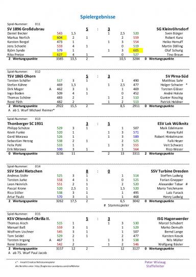 Wir spielten mit: Sven Bürger 520 Holz (1MP), Robert Kunz 559 Holz (0MP), Heiko Hornuff 554 Holz (1MP), Martin Dölling 519 Holz (0MP), Olaf Schurig 605 Holz (1(MP) und Tino Braun 527 Holz (0MP).