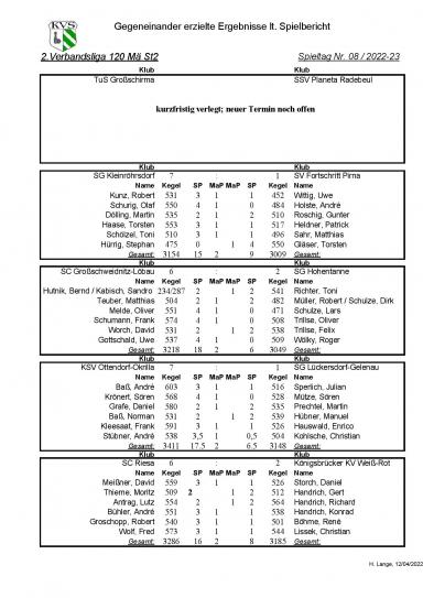 Wir spielten mit: Robert Kunz 531 Holz (1MP), Olaf Schurig 550 Holz (1MP), Martin Dölling 535 Holz mit 204 Räumern (1MP), Torsten Haase 553 Holz mit 200 Räumern (1MP), Toni Schölzel 510 Holz (1MP) und Stephan Hürrig 475 Holz (0MP).