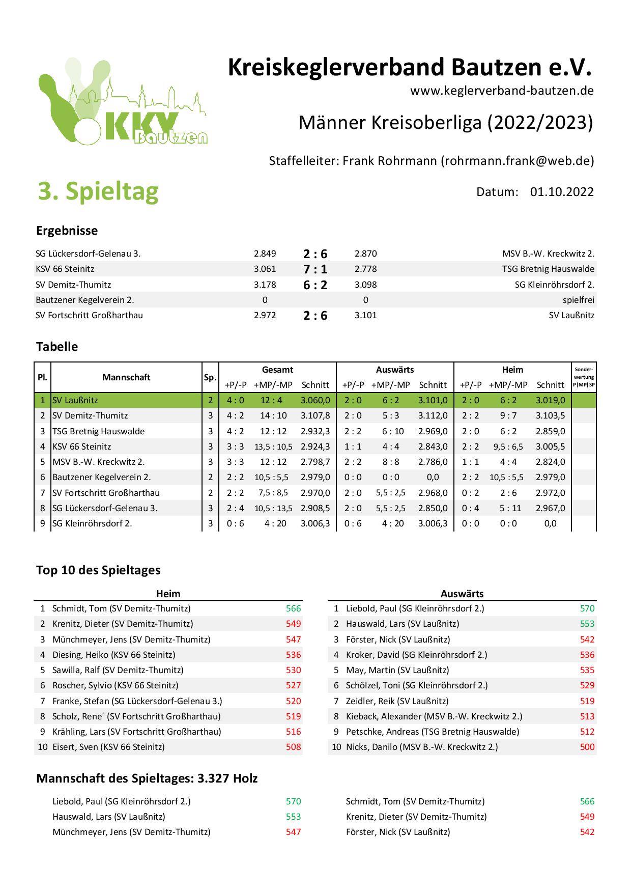 Am 3. Spieltag ging unsere Reise nach Demitz-Thumitz. Nach dem grandiosen Sieg unserer Ersten Mannschaft beim Traditionsturnier vor fünf Wochen in Demitz, wollen wir an dieser Leistung anknüpfen. Im ersten Durchgang konnten sich Toni und Martin leider nicht durchsetzen. Mit 2 Punkten und ca. 70 Holz Rückstand gingen wir in den zweiten Durchgang. Bei Sven war es ein Auf und Ab, welches leider, gegen einen guten Gegner, nicht für einen Punkt reichen sollte. Paul hingegen hat einen sehr guten Tag erwischt und erreichte mit der Tagesbestleistung von 570 Holz den ersten Mannschaftspunkt. Im Dritten Durchgang gingen Marco und David an den Start. Marco unterlag seinem Gegner leider, und musste den Punkt abgeben. David hingegen hat sich den Punkt mit starken 536 Holz sichern können. Trotz alledem hat es leider nicht zu ersten Saisonerfolg gereicht. Beim nächsten Spiel, dem ersten Heimspiel, wollen wir aber endlich unseren ersten Sieg holen!