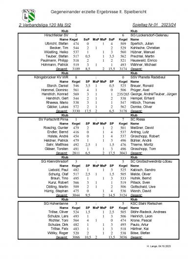 Zum ersten Spiel der neuen Saison hatten wir die Kegler aus Großschweidnitz zu Gast. Von Beginn an behielten sie die Oberhand. Zwischendurch waren wir mal ran, aber es beeindruckte den Gast nicht. Sie spielten ihr Spiel runter und somit haben zum Beginn der Saison die ersten Minuspunkte. Erwähnenswert sind nur Robert seine 566 Holz. Auf seiner zweiten Bahn knallte er eine 171 hin. Weiter so Robert.